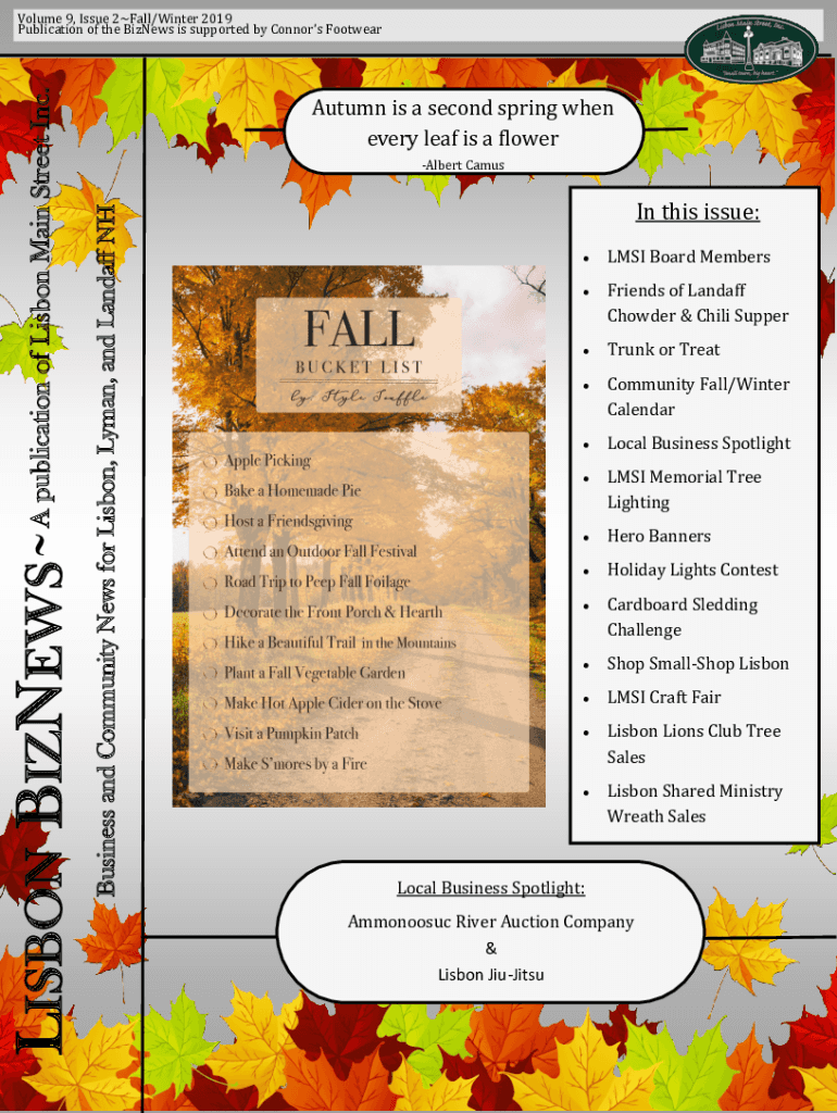 Autumn is a second spring when every leaf is a flower Albert CamusBusiness and Community News for Lisbon, Lyman, and Landaff NHLISBON BIZNEWS A publication of Lisbon Main Street Inc.Volume 9, Issue