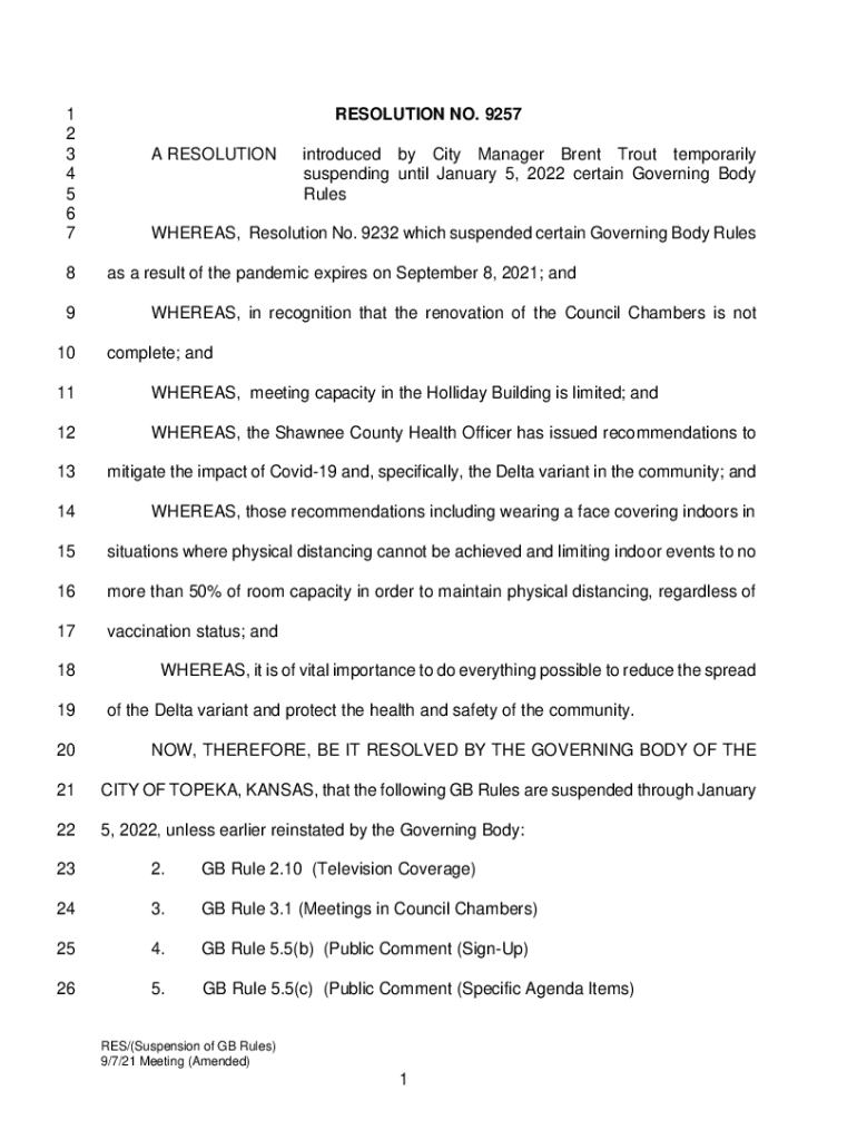 1 2 3 4 5 6 7 8 9 10RESOLUTION NO. 9257 A RESOLUTIONintroduced by City Manager Brent Trout temporarily suspending until January 5, 2022 certain Governing Body RulesWHEREAS, Resolution No. 9232 which