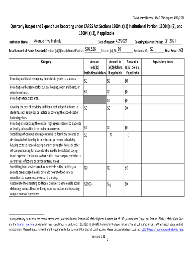 OMB Control Number 18400849 Expires 4/30/2021Quarterly Budget and Expenditure Reporting under CARES Act Sections 18004(a)(1) Institutional Portion, 18004(a)(2), and 18004(a)(3), if applicable Avenue