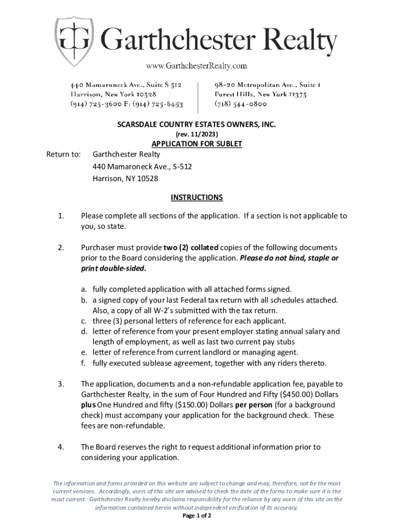 SCARSDALE COUNTRY ESTATES OWNERS, INC. (rev. 11/2023)Return to:APPLICATION FOR SUBLET Garthchester Realty 440 Mamaroneck Ave., S512 Harrison, NY 10528 INSTRUCTIONS1.Please complete all sections of