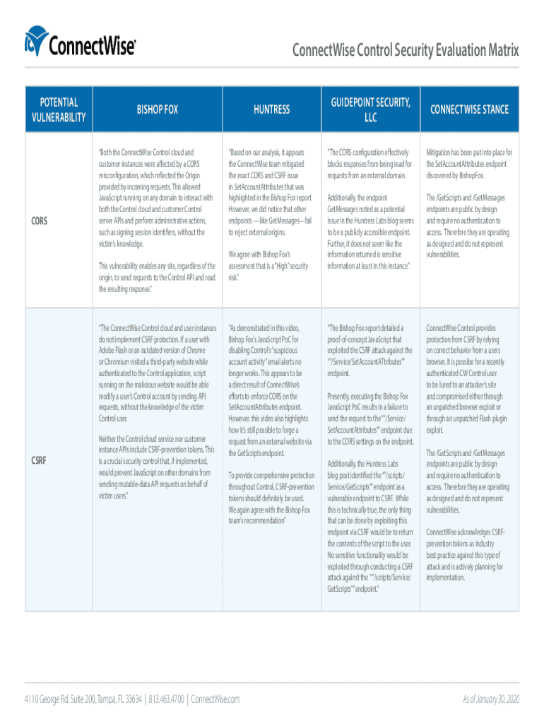 ConnectWise Control Security Evaluation Matrix POTENTIAL VULNERABILITYCORSBISHOP FOX Both the ConnectWise Control cloud and customer instances were affected by a CORS misconfiguration, which reflected
