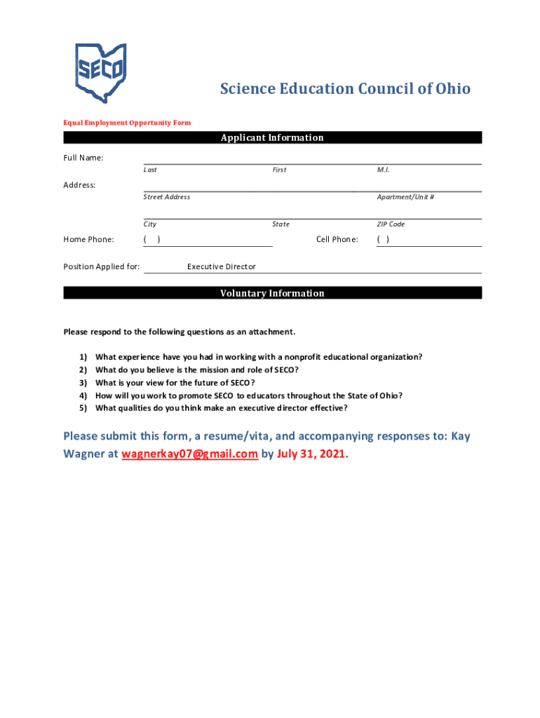 Science Education Council of Ohio Equal Employment Opportunity FormApplicant Information Full Name: LastFirstM.I.Address: Street AddressApartment/Unit #CityHome Phone: Position Applied for:(State)ZIP