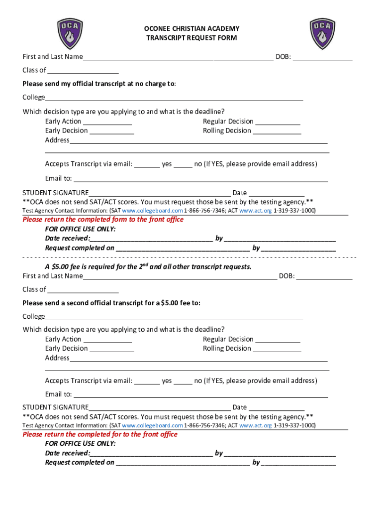 OCONEE CHRISTIAN ACADEMY TRANSCRIPT REQUEST FORM First and Last Name___ DOB: ___ Class of ___ Please send my official transcript at no charge to: College___ Which decision type are you applying to