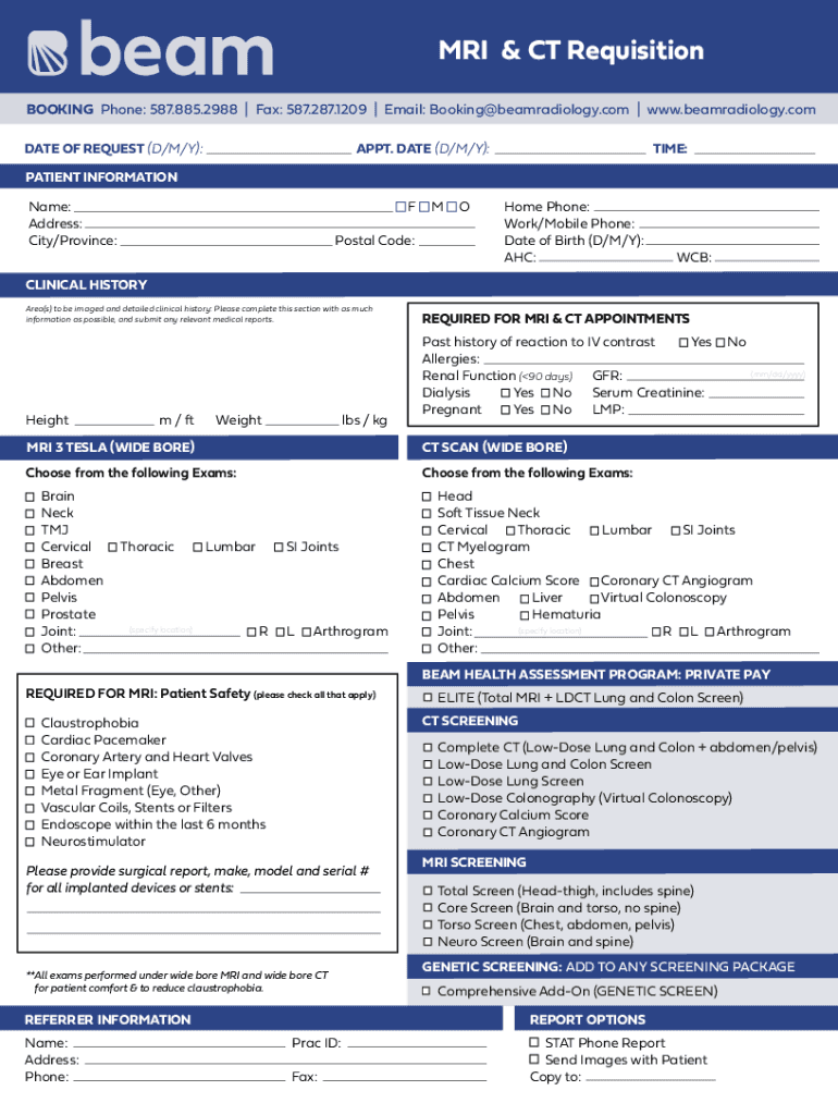 MRI & CT Requisition BOOKING Phone: 587.885.2988 | Fax: 587.287.1209 | Email: Booking@beamradiology.com | www.beamradiology.com DATE OF REQUEST (D/M/Y):APPT. DATE (D/M/Y):TIME:PATIENT INFORMATION