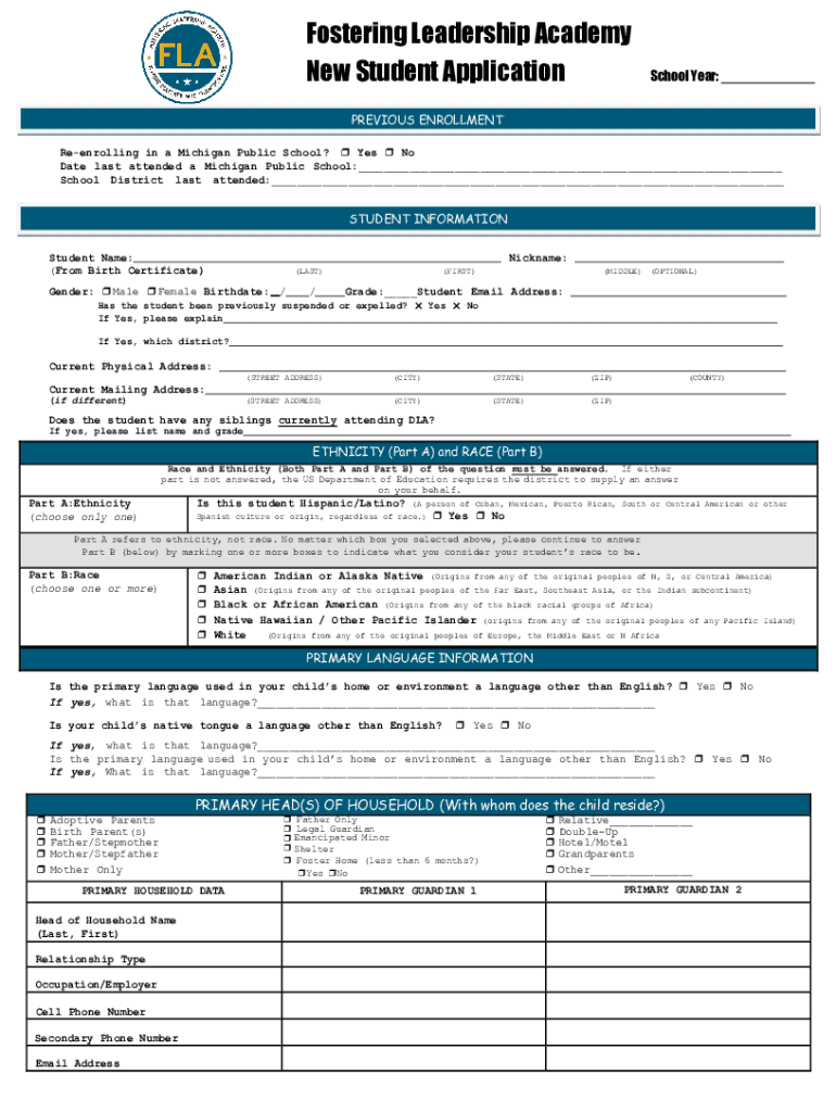 Fostering Leadership Academy New Student ApplicationSchool Year:PREVIOUS ENROLLMENT Reenrolling in a Michigan Public School? Yes No Date last attended a Michigan Public School:___ School District