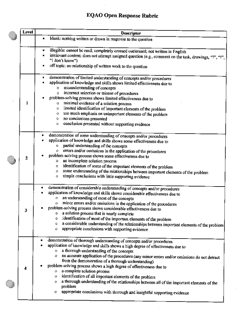EQAO Open Response Rubric LevelDescriptor .blank: nothing written or drawn in response to the question.illegible: cannot be read; completely crossed ouflerased; not written in English irrelevant content: