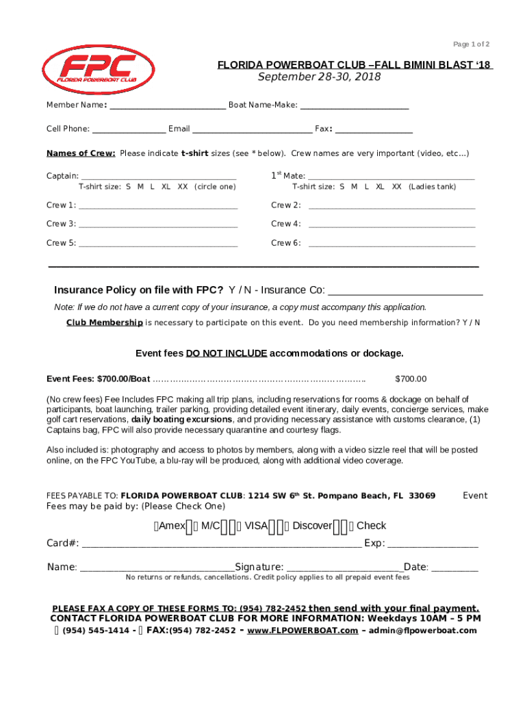 The FPC Bimini Blast Fall 2018 Detour to Marathon Poker Run is a Word document that has to be filled-out and signed for specified needs. Then, it is provided to the exact addressee to provide some details and data. The completion and signing is available manually in hard copy or via a suitable application like PDFfiller. Such tools help to send in any PDF or Word file without printing out. While doing that, you can edit its appearance according to your needs and put an official legal electronic signature. Once you're good, the user ought to send the FPC Bimini Blast Fall 2018 Detour to Marathon Poker Run to the respective recipient or several ones by mail and even fax. PDFfiller has got a feature and options that make your blank printable. It has a variety of options when printing out appearance. No matter, how you will file a document - in hard copy or by email - it will always look neat and firm. In order not to create a new editable template from scratch every time, make the original Word file as a template. After that, you will have a customizable sample.
