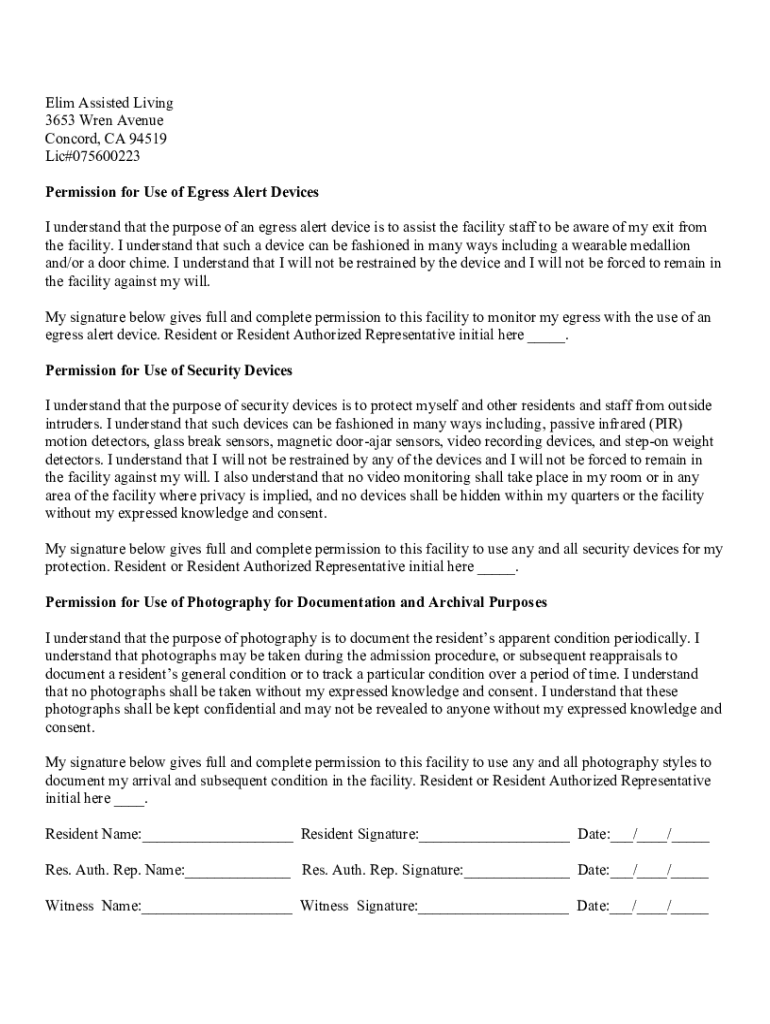 Elim Assisted Living 3653 Wren Avenue Concord, CA 94519 Lic#075600223 Permission for Use of Egress Alert Devices I understand that the purpose of an egress alert device is to assist the facility staff