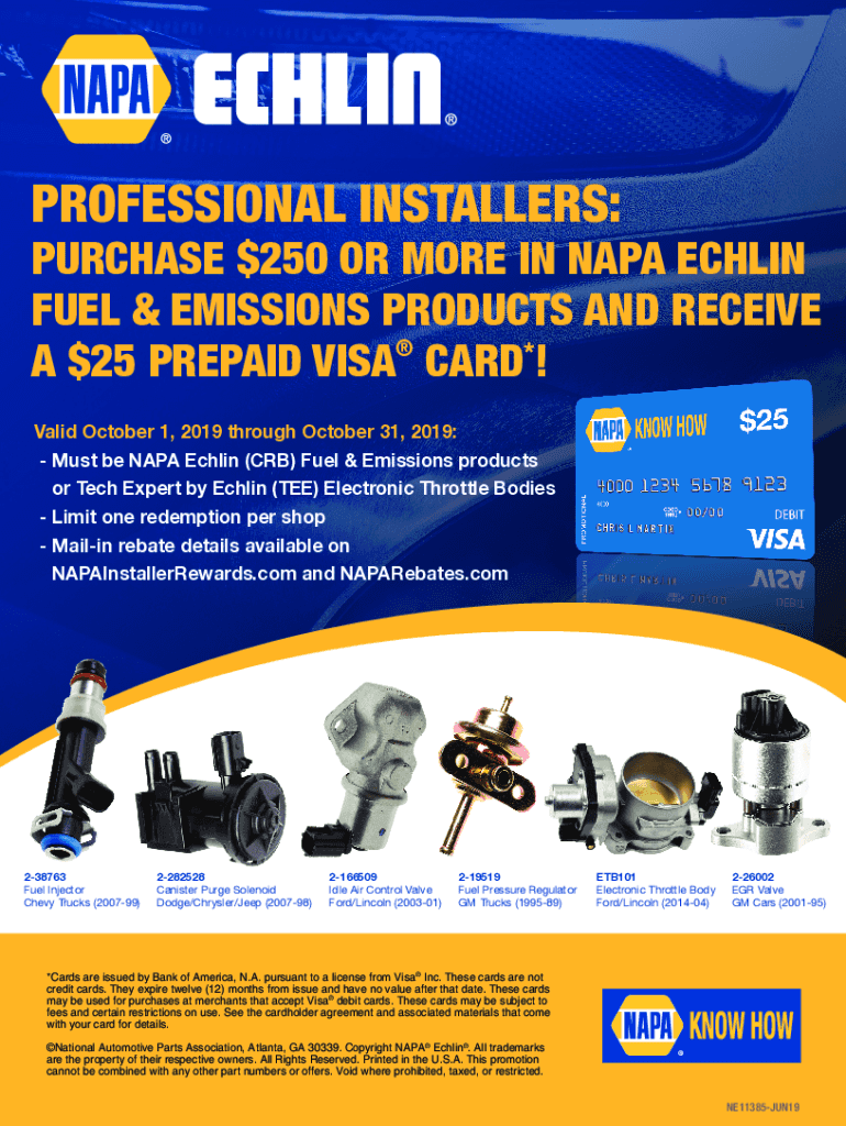 PROFESSIONAL INSTALLERS:PURCHASE $250 OR MORE IN NAPA ECHLIN FUEL & EMISSIONS PRODUCTS AND RECEIVE * PMS Reflex Blue c/100 !m/73 y/0 k/2 A $25 PREPAID VISA CARD PMS 123 c/0 m/24 y/94 k/0 White c/0