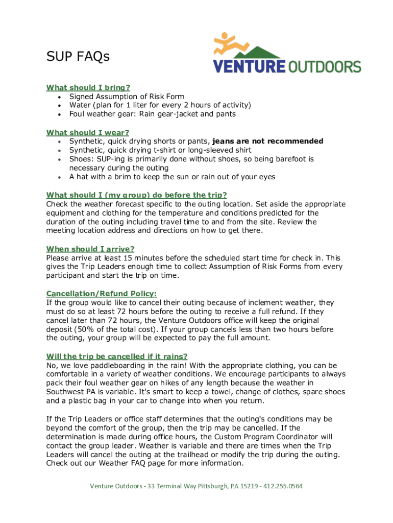 SUP FAQs What should I bring? Signed Assumption of Risk Form Water (plan for 1 liter for every 2 hours of activity) Foul weather gear: Rain gearjacket and pants What should I wear? Synthetic, quick
