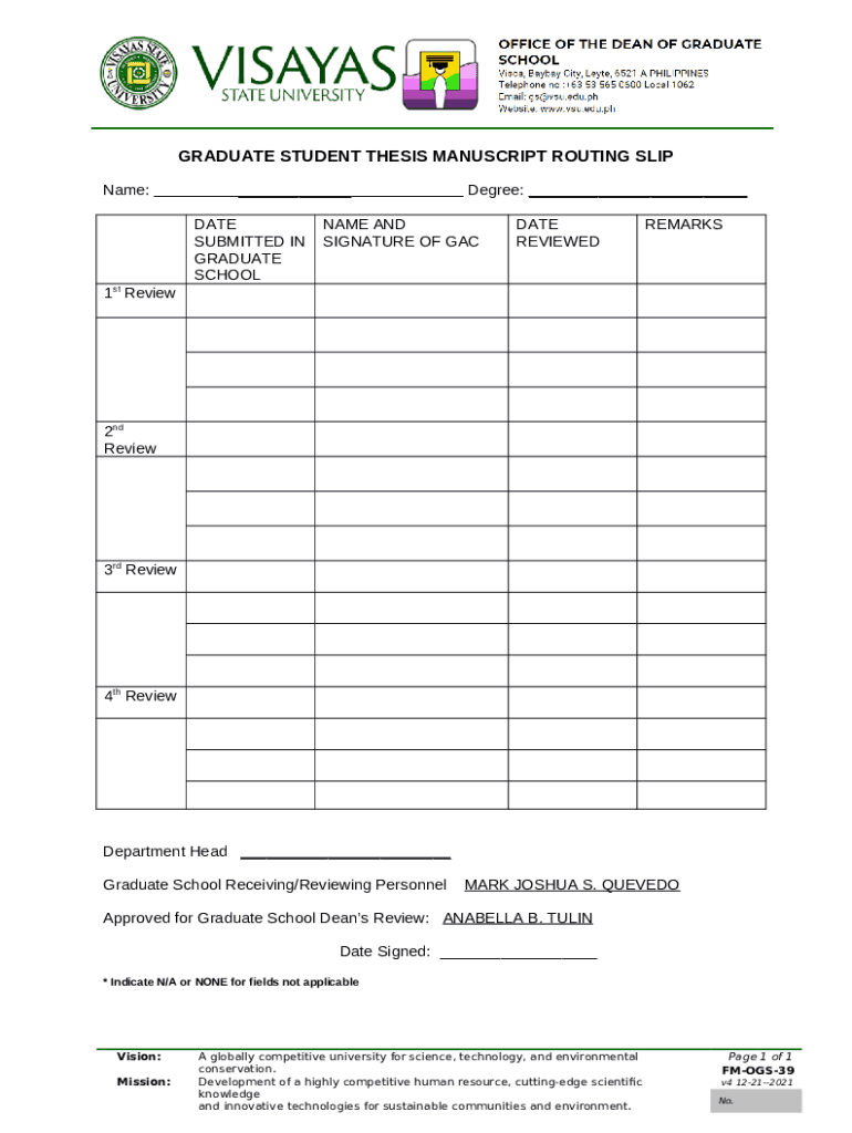 Instructions for the GRADUATE STUDENT THESIS MANUSCRIPT ROUTING SLIP form