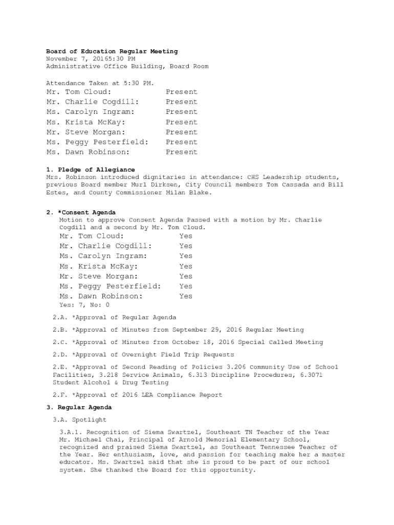 Board of Education Regular Meeting November 7, 20165:30 PM Administrative Office Building, Board Room Attendance Taken at 5:30 PM.Mr. Mr. Ms. Ms. Mr. Ms. Ms.Tom Cloud: Charlie Cogdill: Carolyn Ingram: