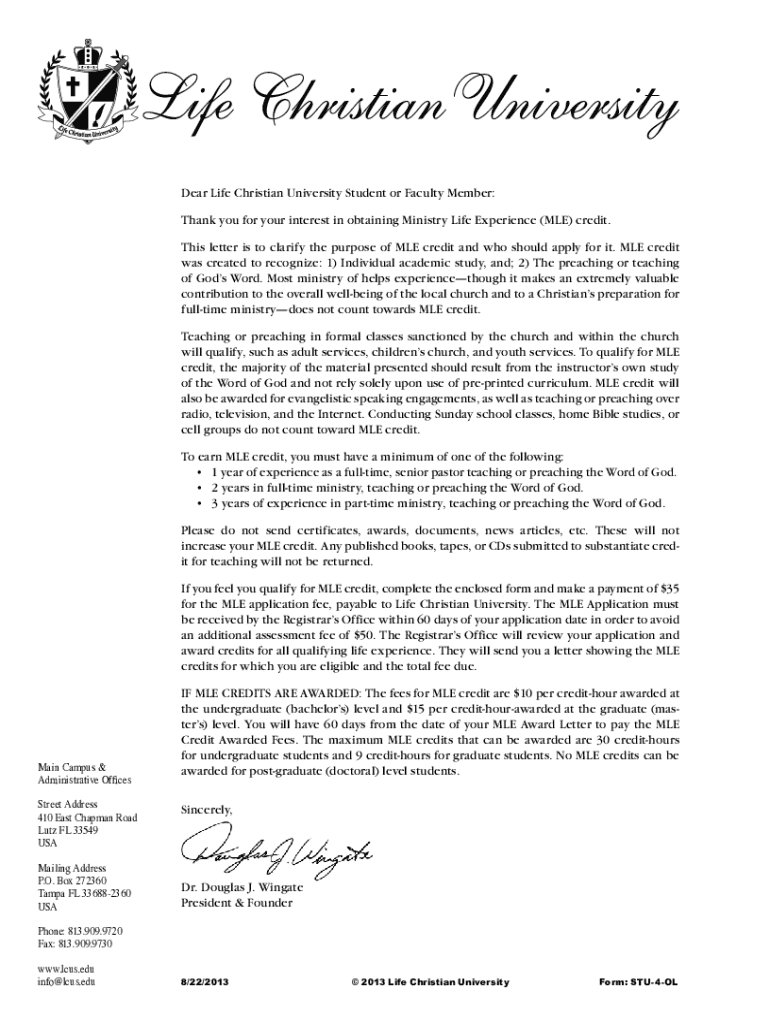 Dear Life Christian University Student or Faculty Member: Thank you for your interest in obtaining Ministry Life Experience (MLE) credit. This letter is to clarify the purpose of MLE credit and who