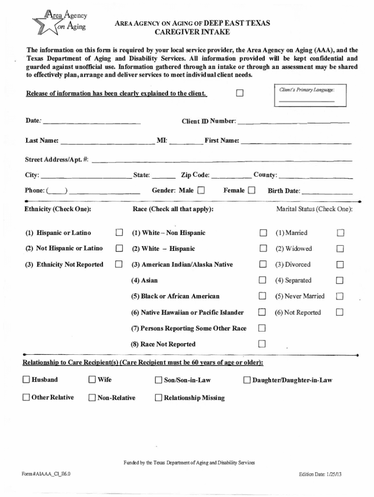 Area AgencyAREA AGENCY ON AGING OF DEEP EAST TEXAS CAREGIVER INTAKEiAgingThe information on this form is required by your local service provider, the Area Agency on Aging (AAA), and the Texas Department