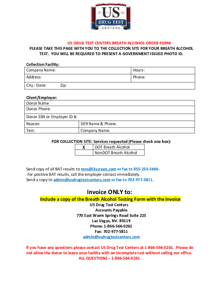 US DRUG TEST CENTERS BREATH ALCOHOL ORDER FORM