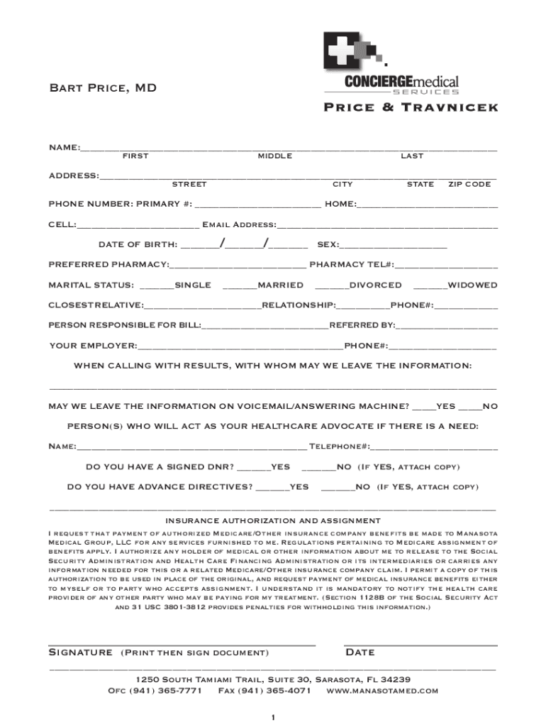 Bart Price, MD NAME:___ FIRSTMIDDLELASTADDRESS:___ STREETCITYSTATEZIP CODEPHONE NUMBER: PRIMARY #: ___ HOME:___ CELL:___ Email Address:___//DATE OF BIRTH: ___ ___ ___ SEX:___ PREFERRED PHARMACY:___