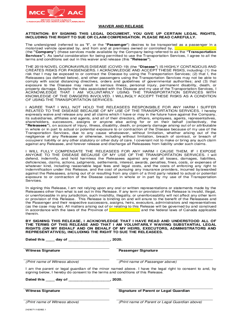 WAIVER AND RELEASE ATTENTION: BY SIGNING THIS LEGAL DOCUMENT, YOU GIVE UP CERTAIN LEGAL RIGHTS, INCLUDING THE RIGHT TO SUE OR CLAIM COMPENSATION. PLEASE READ CAREFULLY. The undersigned (referred to