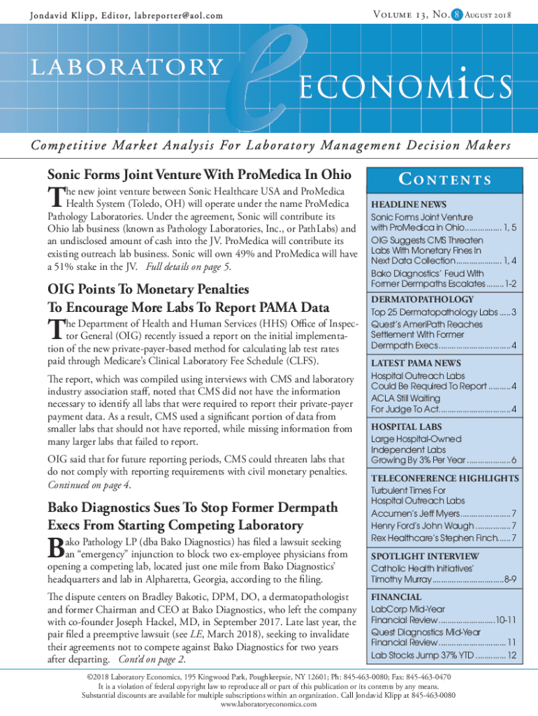 Volume 13, No. 8 August 2018Sonic Forms Joint Venture With ProMedica In OhioThe new joint venture between Sonic Healthcare USA and ProMedica Health System (Toledo, OH) will operate under the name