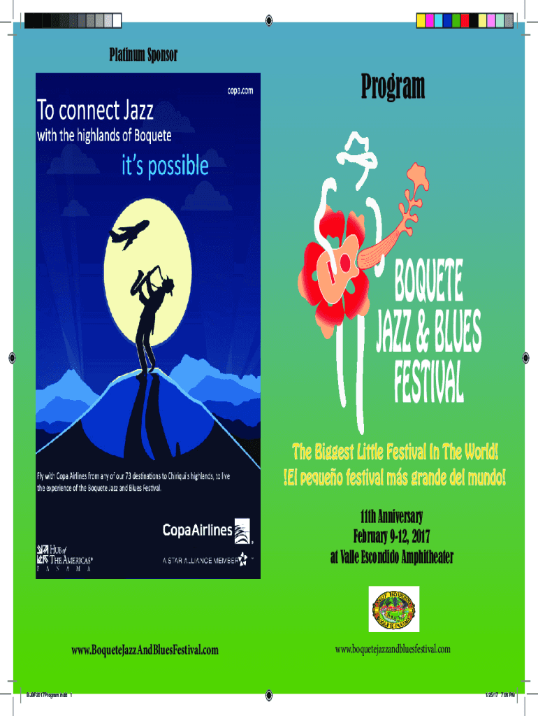 Platinum SponsorProgramBOQUETE JAZZ & BLUES FESTIVAL The Biggest Little Festival In The World! !El pequeo festival ms grande del mundo! 11th Anniversary February 912, 2017 at Valle Escondido Amphitheaterwww.BoqueteJazzAndBluesFestival.com