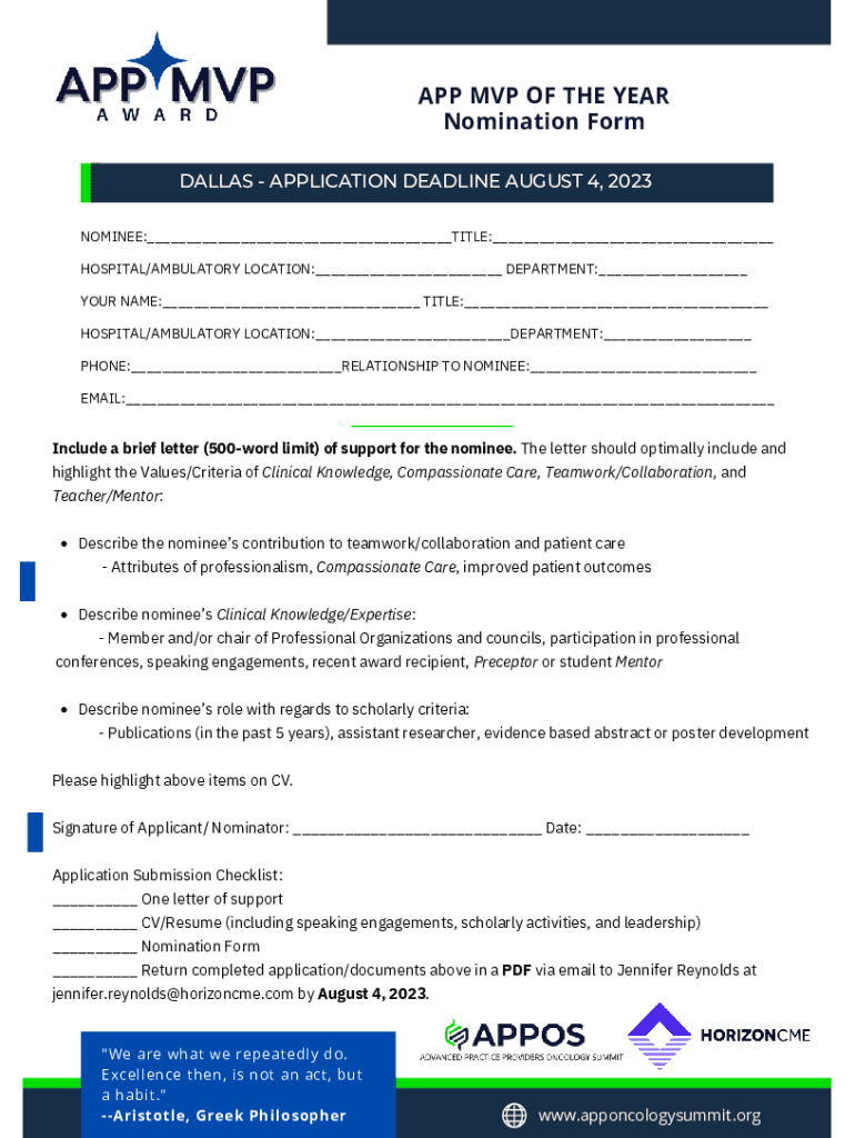 APP MVP OF THE YEAR Nomination Form DALLAS APPLICATION DEADLINE AUGUST 4, 2023, NOMINEE:___TITLE:___ HOSPITAL/AMBULATORY LOCATION:___ DEPARTMENT:___YOUR NAME:___ TITLE:___HOSPITAL/AMBULATORY LOCATION:___DEPARTMENT:___PHONE:___RELATIONSHIP
