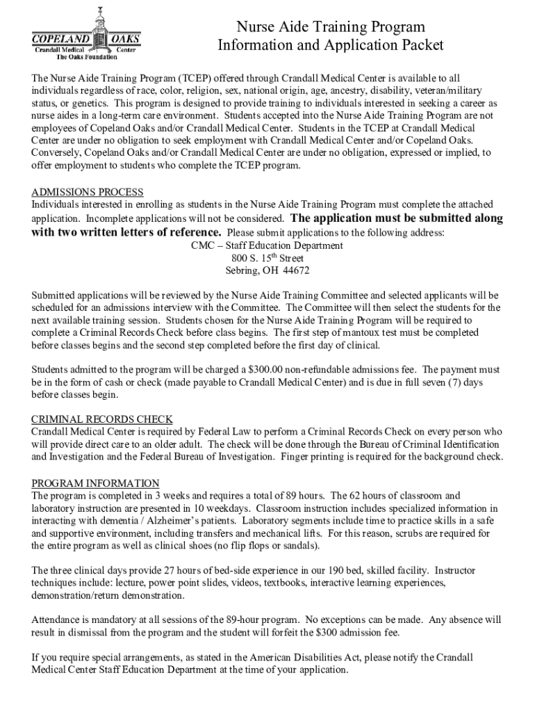 Nurse Aide Training Program Information and Application Packet The Nurse Aide Training Program (TCEP) offered through Crandall Medical Center is available to all individuals regardless of race, color,