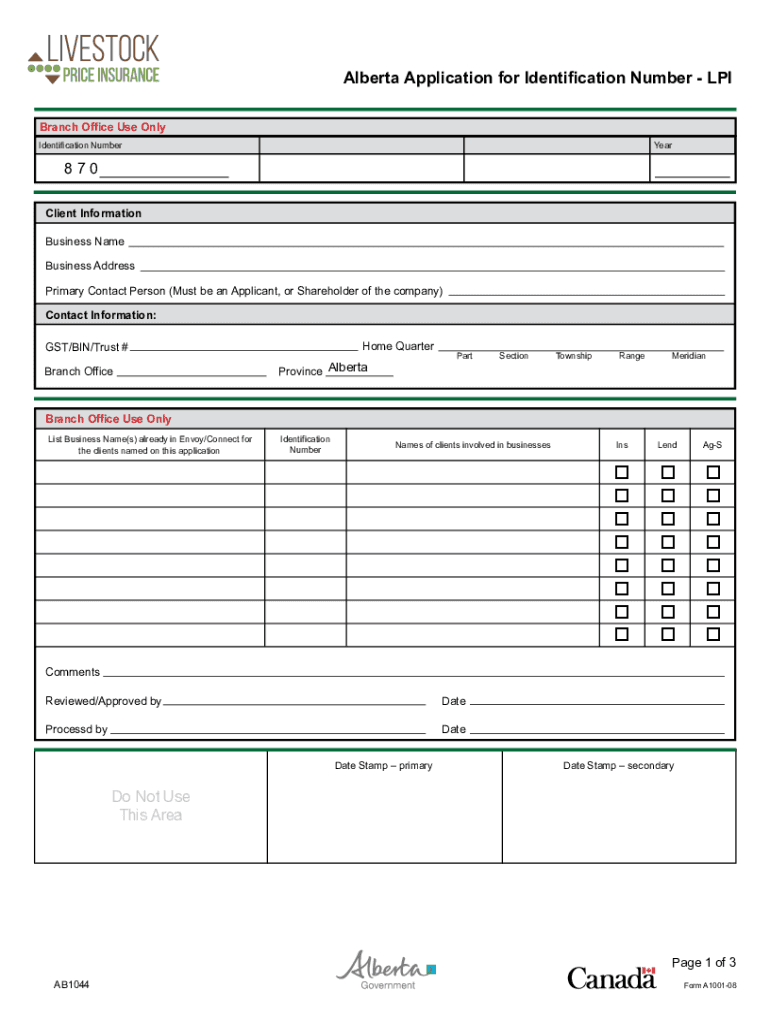 Alberta Application for Identification Number LPI Branch Office Use Only Identification NumberYear870 Client Information Business Name Business Address Primary Contact Person (Must be an Applicant,