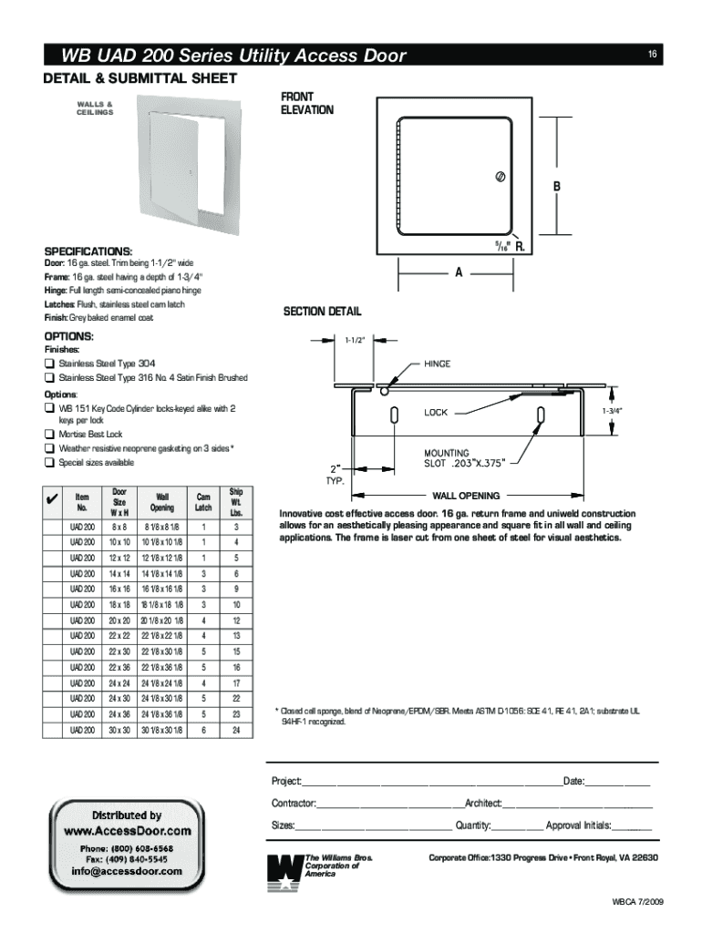 WB UAD 200 Series Utility Access Door16DETAIL & SUBMITTAL SHEET FRONT ELEVATIONWALLS & CEILINGSB5/16\" R.SPECIFICATIONS: Door: 16 ga. steel. Trim being 11/2\" wide Frame: 16 ga. steel having a depth