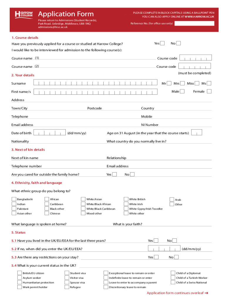 PLEASE COMPLETE IN BLOCK CAPITALS USING A BALLPOINT PEN YOU CAN ALSO APPLY ONLINE AT WWW.HARROW.AC.UK Please return to Admissions (Student Records), Park Road, Uxbridge, Middlesex, UB8 1NQ admissions@hruc.ac.ukReference