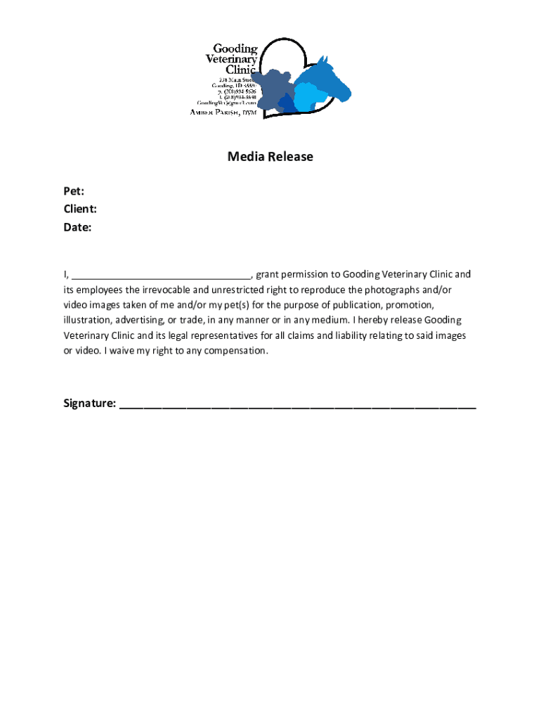 Media Release Pet: Client: Date:I, ___, grant permission to Gooding Veterinary Clinic and its employees the irrevocable and unrestricted right to reproduce the photographs and/or video images taken