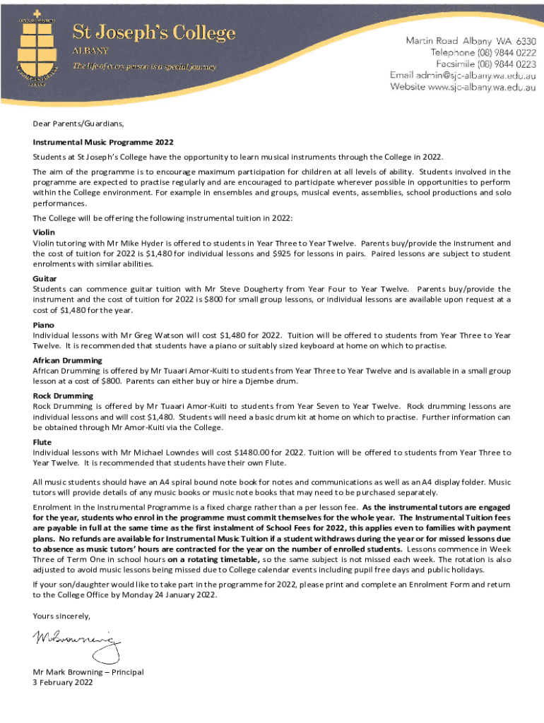 Dear Parents/Guardians, Instrumental Music Programme 2022 Students at St Josephs College have the opportunity to learn musical instruments through the College in 2022. The aim of the programme is