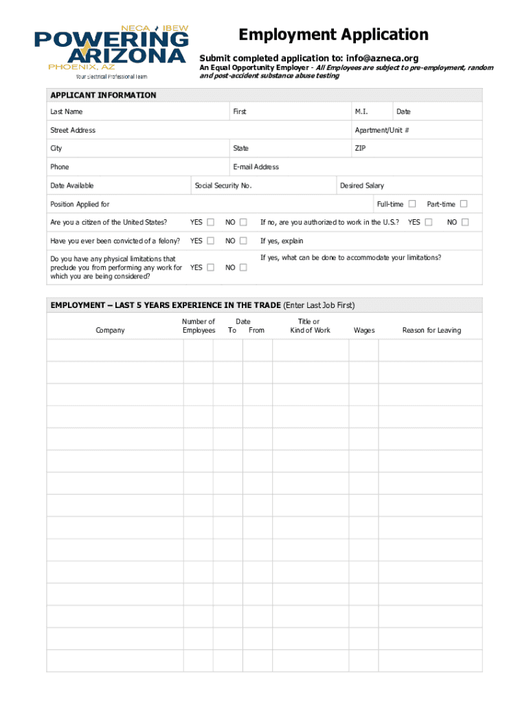 Employment Application Submit completed application to: info@azneca.orgAn Equal Opportunity Employer All Employees are subject to preemployment, random and postaccident substance abuse testingAPPLICANT