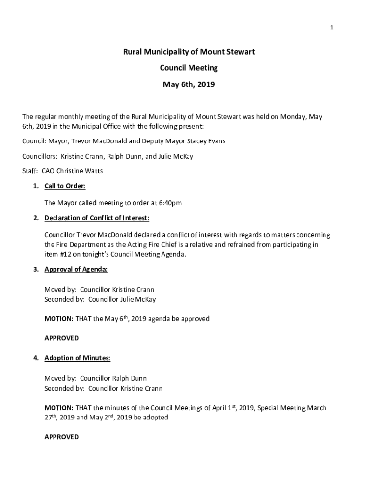 1Rural Municipality of Mount Stewart Council Meeting May 6th, 2019The regular monthly meeting of the Rural Municipality of Mount Stewart was held on Monday, May 6th, 2019 in the Municipal Office with