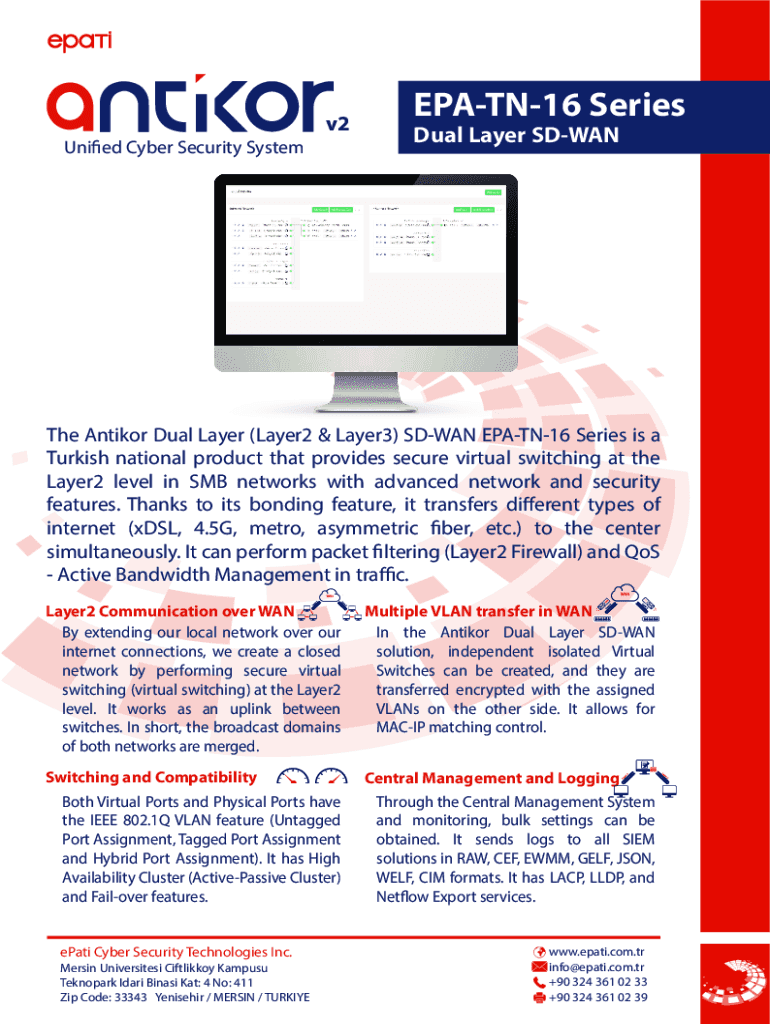 Dual Layer SDWANThe Antikor Dual Layer (Layer2 & Layer3) SDWAN EPATN16 Series is a