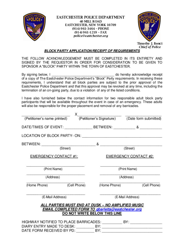 EASTCHESTER POLICE DEPARTMENT 40 MILL ROAD EASTCHESTER, NEW YORK 10709 (914) 9613464 PHONE (914) 9611219 FAX police@eastchester.org Timothy J. Bonci Chief of PoliceBLOCK PARTY APPLICATION/RECEIPT