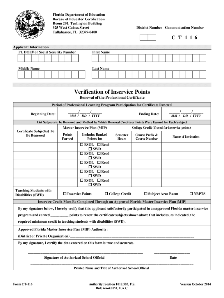 Florida Department of Education Bureau of Educator Certification Room 201, Turlington Building 325 West Gaines Street Tallahassee, FL 323990400District Number Communication NumberC T 1 1 6 Applicant