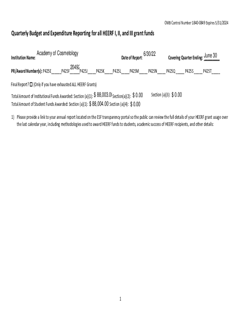 OMB Control Number 18400849 Expires 5/31/2024Quarterly Budget and Expenditure Reporting for all HE ERF I, II, and III grant funds