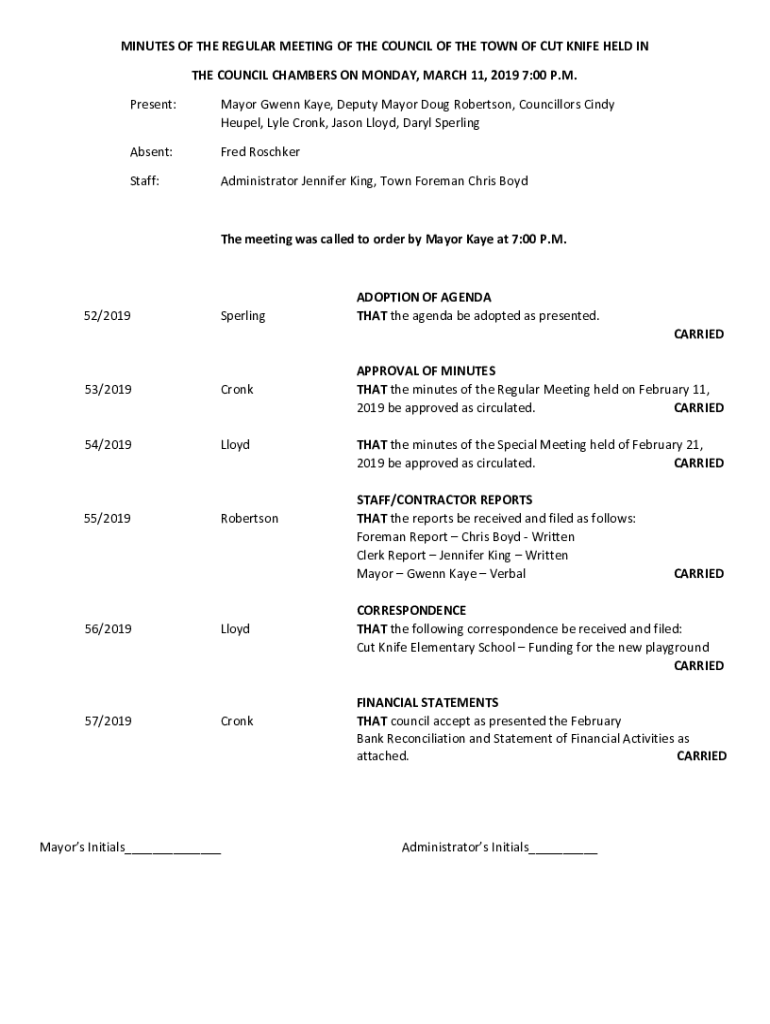 MINUTES OF THE REGULAR MEETING OF THE COUNCIL OF THE TOWN OF CUT KNIFE HELD IN THE COUNCIL CHAMBERS ON MONDAY, MARCH 11, 2019 7:00 P.M. Present:Mayor Gwenn Kaye, Deputy Mayor Doug Robertson, Councillors