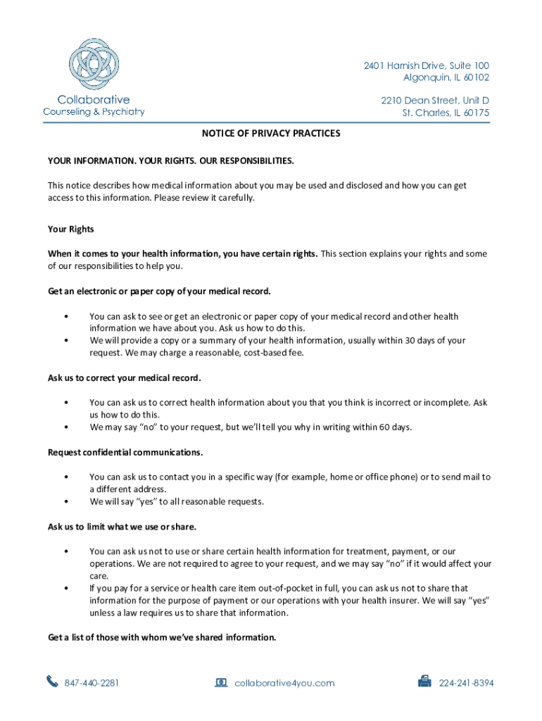 2401 Harnish Drive, Suite 100 Algonquin, IL 60102 2210 Dean Street, Unit D St. Charles, IL 60175NOTICE OF PRIVACY PRACTICES YOUR INFORMATION. YOUR RIGHTS. OUR RESPONSIBILITIES. This notice describes