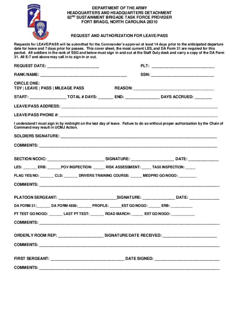 DEPARTMENT OF THE ARMY HEADQUARTERS AND HEADQUARTERS DETACHMENT 82ND SUSTAINMENT BRIGADE TASK FORCE PROVIDER FORT BRAGG, NORTH CAROLINA 28310 REQUEST AND AUTHORIZATION FOR LEAVE/PASS Requests for