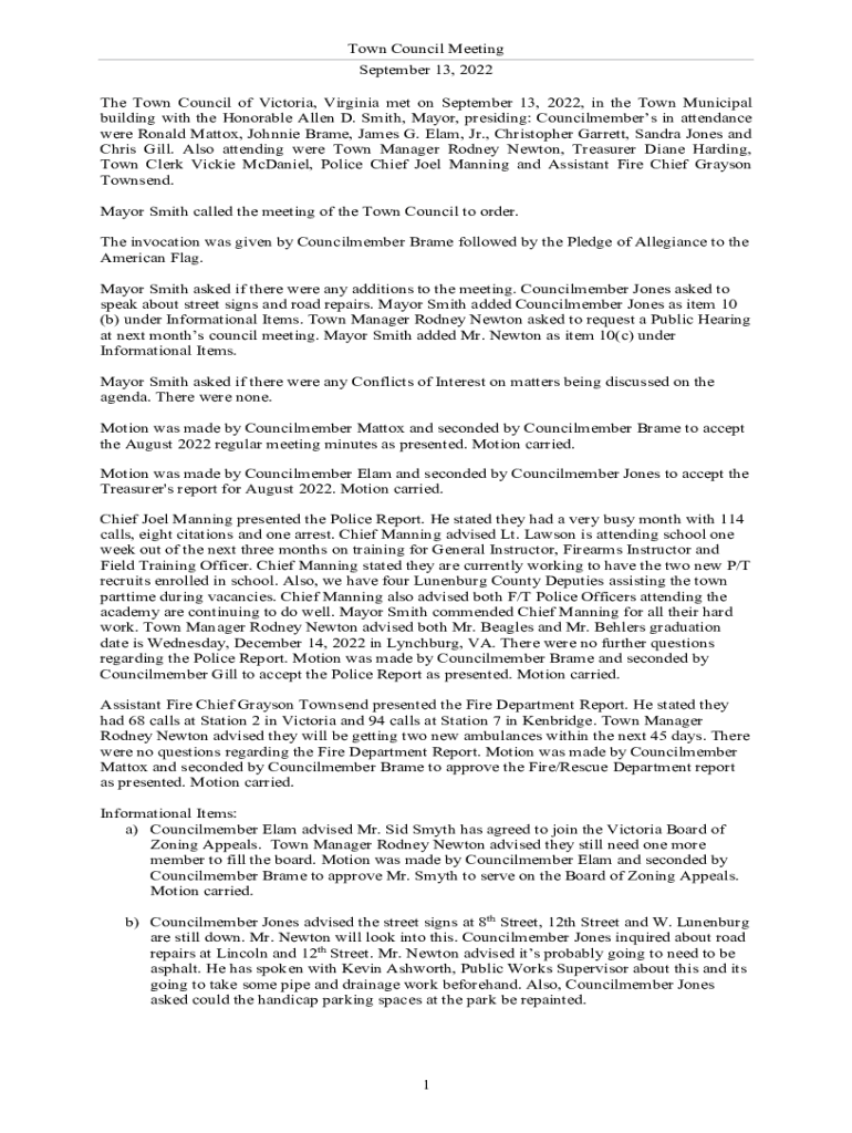 Town Council Meeting September 13, 2022 The Town Council of Victoria, Virginia met on September 13, 2022, in the Town Municipal building with the Honorable Allen D. Smith, Mayor, presiding: Councilmembers
