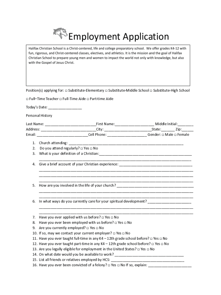 Employment ApplicationPosition(s) applying for: SubstituteElementary SubstituteMiddle School SubstituteHigh School FullTime Teacher FullTime Aide Parttime Aide Todays Date: ___ Personal History Last
