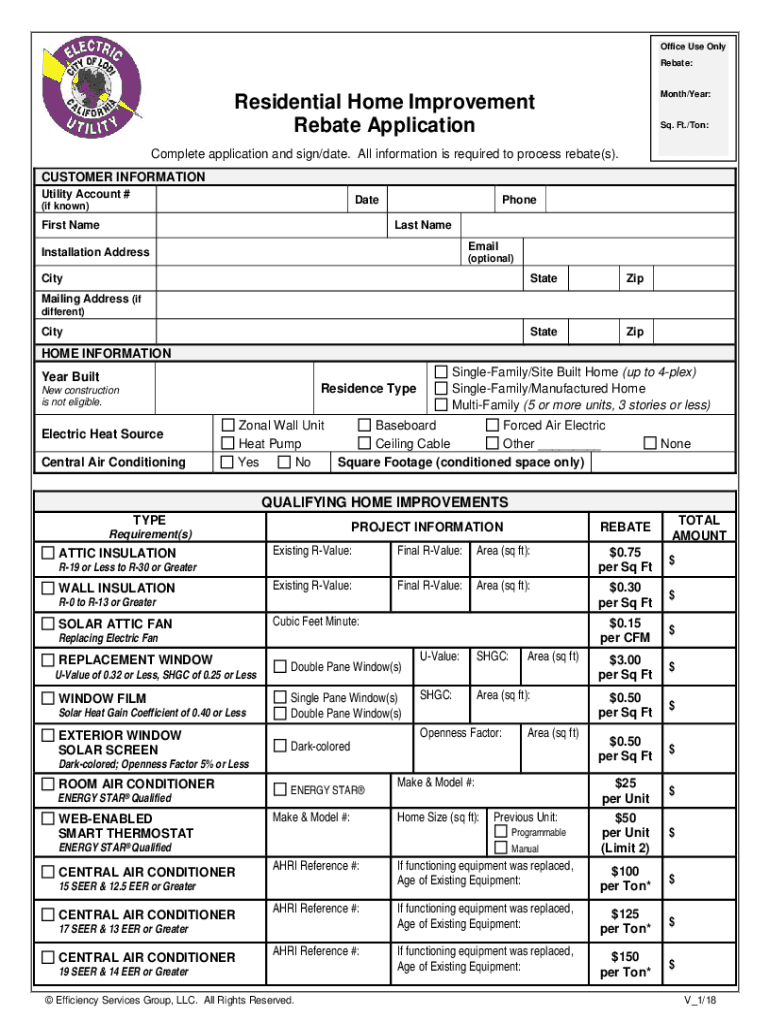 Office Use Only Rebate:Month/Year:Residential Home Improvement Rebate ApplicationSq. Ft./Ton:Complete application and sign/date. All information is required to process rebate(s). CUSTOMER INFORMATION