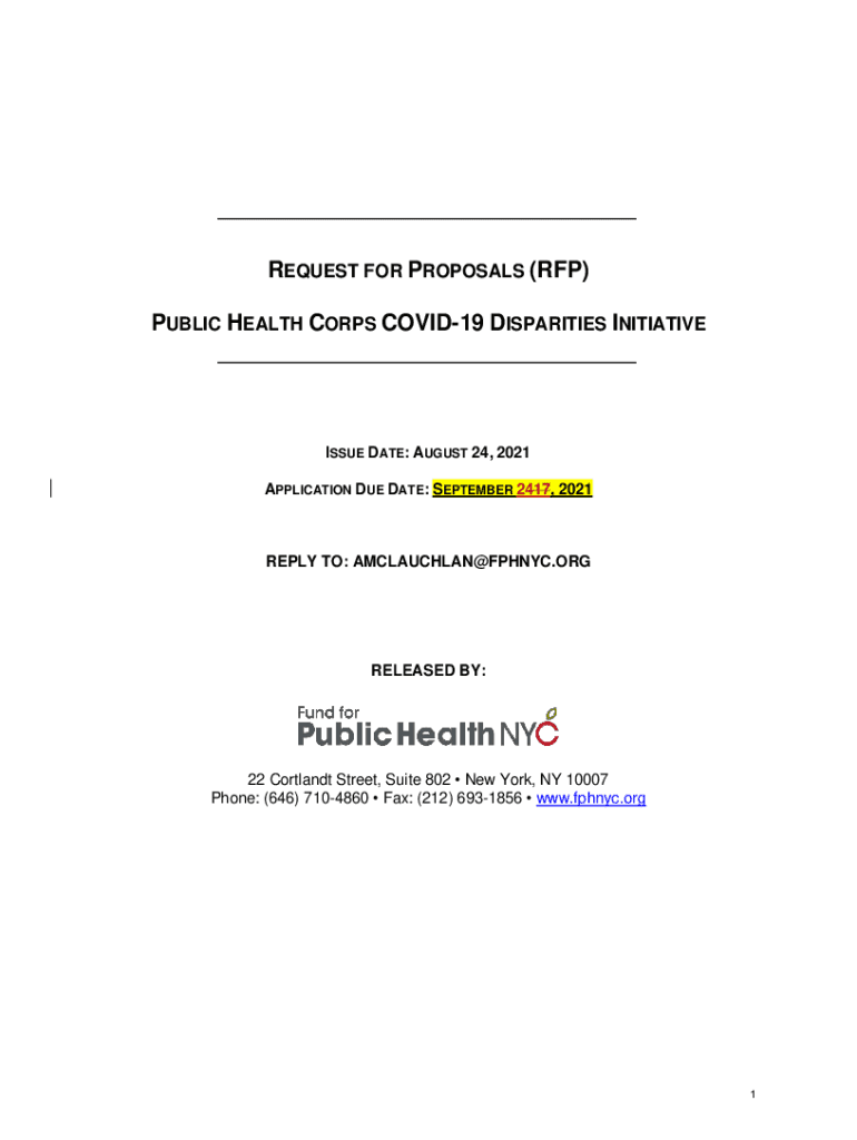 REQUEST FOR PROPOSALS (RFP) PUBLIC HEALTH CORPS COVID19 DISPARITIES INITIATIVEISSUE DATE: AUGUST 24, 2021 APPLICATION DUE DATE: SEPTEMBER 2417, 2021REPLY TO: AMCLAUCHLAN@FPHNYC.ORGRELEASED BY:22 Cortlandt