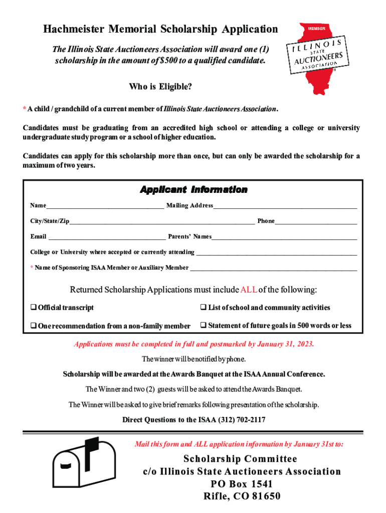 Hachmeister Memorial Scholarship Application The Illinois State Auctioneers Association will award one (1) scholarship in the amount of $500 to a qualified candidate. Who is Eligible? * A child /