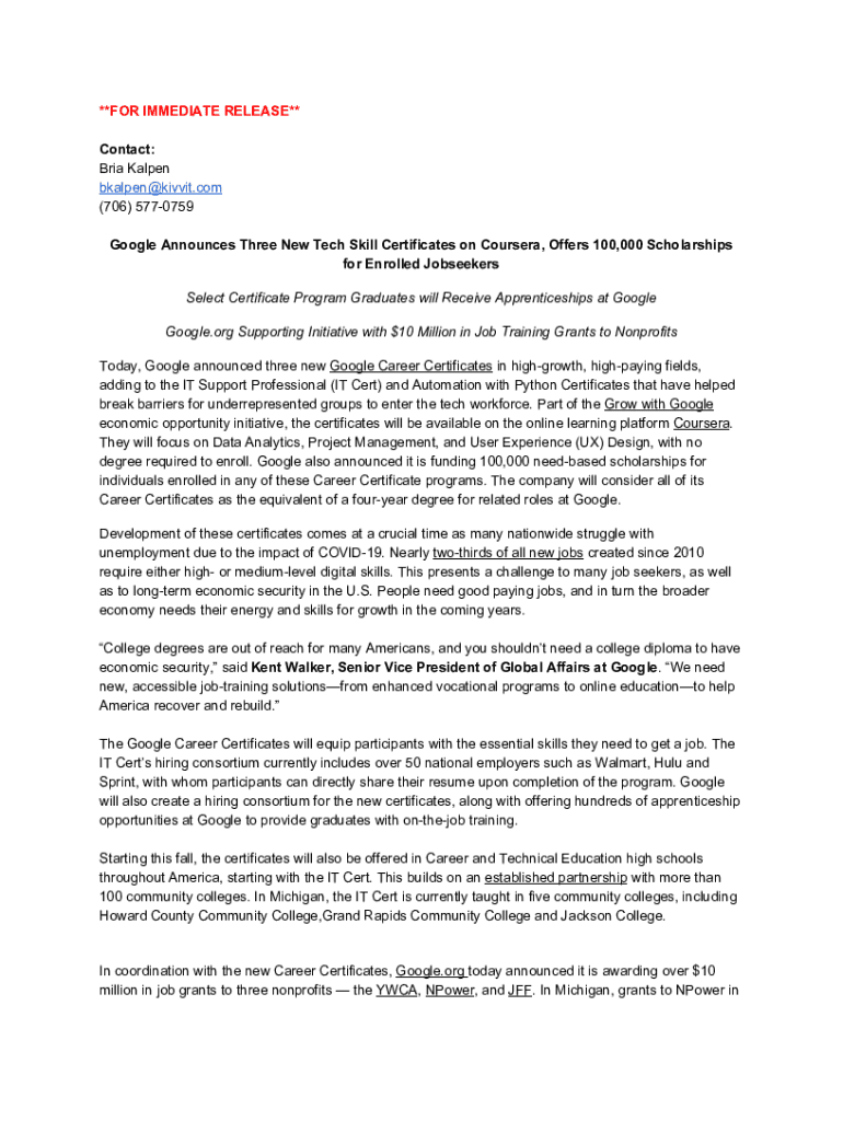 **FOR IMMEDIATE RELEASE** Contact: Bria Kalpen bkalpen@kivvit.com (706) 5770759 Google Announces Three New Tech Skill Certificates on Coursera, Offers 100,000 Scholarships for Enrolled Jobseekers