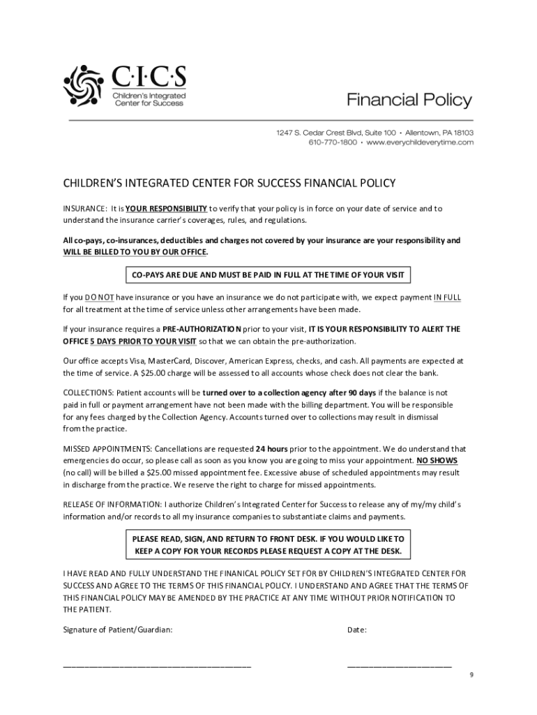 CHILDRENSINTEGRATEDCENTERFORSUCCESSFINANCIALPOLICY INSURANCE:ItisYOURRESPONSIBILITYtoverifythatyourpolicyisinforceonyourdateofserviceandto understandtheinsurancecarrierscoverages,rules,andregulations.