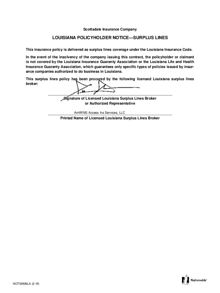 Scottsdale Insurance CompanyLOUISIANA POLICYHOLDER NOTICESURPLUS LINES This insurance policy is delivered as surplus lines coverage under the Louisiana Insurance Code. In the event of the insolvency