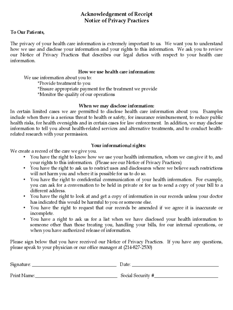 Acknowledgement of Receipt Notice of Privacy Practices To Our Patients, The privacy of your health care information is extremely important to us. We want you to understand how we use and disclose