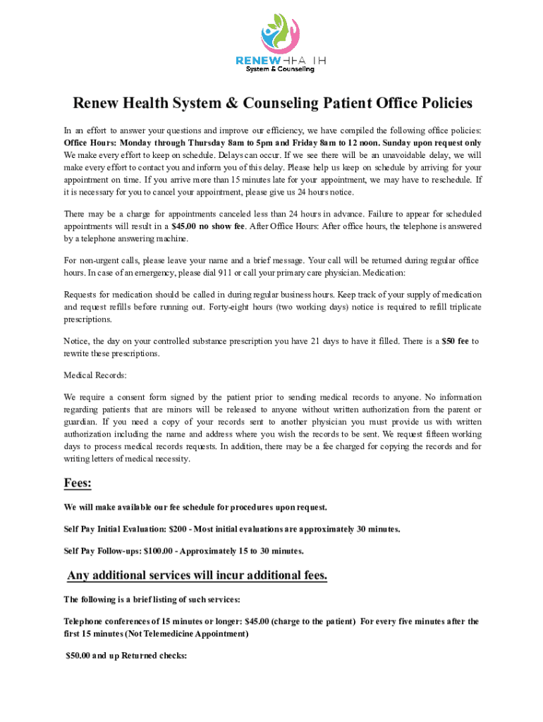 Renew Health System & Counseling Patient Office Policies In an effort to answer your questions and improve our efficiency, we have compiled the following office policies: Office Hours: Monday through