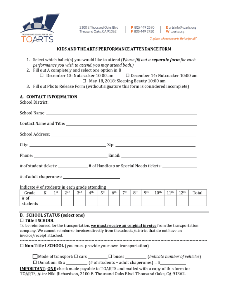 KIDS AND THE ARTS PERFORMANCE ATTENDANCE FORM 1. Select which ballet(s) you would like to attend (Please fill out a separate form for each performance you wish to attend, you may attend both.) 2.